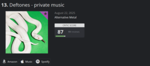 Oceny płyty „private music” bardzo dobre, na serwisie metacritic.com obecnie jest na 4 miejscu, a na albumoftheyear.org to 13 jako miejsce płyta 2025 roku.