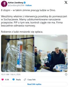 8 stopni — w takim zimnie pracują ludzie w Dino – napisał. – Weszliśmy właśnie z interwencją poselską do pomieszczeń w Sochaczewie. Mamy udokumentowane naruszenie przepisów. PIP o tym wie, kontroli ciągle nie ma. Firma bezczelnie odmawia rozmowy. Robienie z ludzi mrożonki się opłaca.