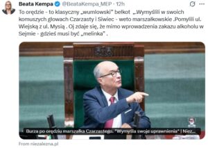 Super Express napisał, że Beata Kempa (59 l.) wywołała burzę w mediach społecznościowych ostrym wpisem dotyczącym wyboru Włodzimierza Czarzastego (65 l.) na marszałka Sejmu. Posłanka twierdzi, że jest to „powrót neokomuny”. W swoim wpisie przywołuje dramatyczne obrazy z czasów PRL – represje wobec bohaterów, upokorzenia narodu, przymusową emigrację elit intelektualnych – i wprost oskarża Tuska, pisząc: „Czarzasty – wstydem @donaldtusk”. Podkreśla brak honoru i przywiązania do wartości państwowych wśród rządzących, określając ich jako Koalicję 13 grudnia, która „bardziej służy pogromcom SB-ków niż wolnej Polsce”. Wpis kończy dramatycznym stwierdzeniem: „Czarny dzień dzisiaj nastał”, co spotkało się z szerokim echem w mediach i polityce. Politycy PiS cytowali wpis jako obronę wartości narodowych, podczas gdy przedstawiciele PO krytykowali go za emocjonalny ton i manipulacje historyczne, co wywołało intensywne starcie narracji w sieci.