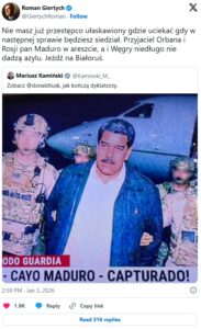 Po sobotnich wydarzeniach, kiedy to jednostki specjalne USA pojmały i wywiozły z kraju Nicolasa Maduro, prezes i redaktor naczelny TV Republika Tomasz Sakiewicz zamieścił na portalu X krótki wpis, w którym zasugerował, że rząd Donalda Tuska może wkrótce upaść w podobny sposób jak rządy Baszszara al-Asada i Nicolása Maduro.